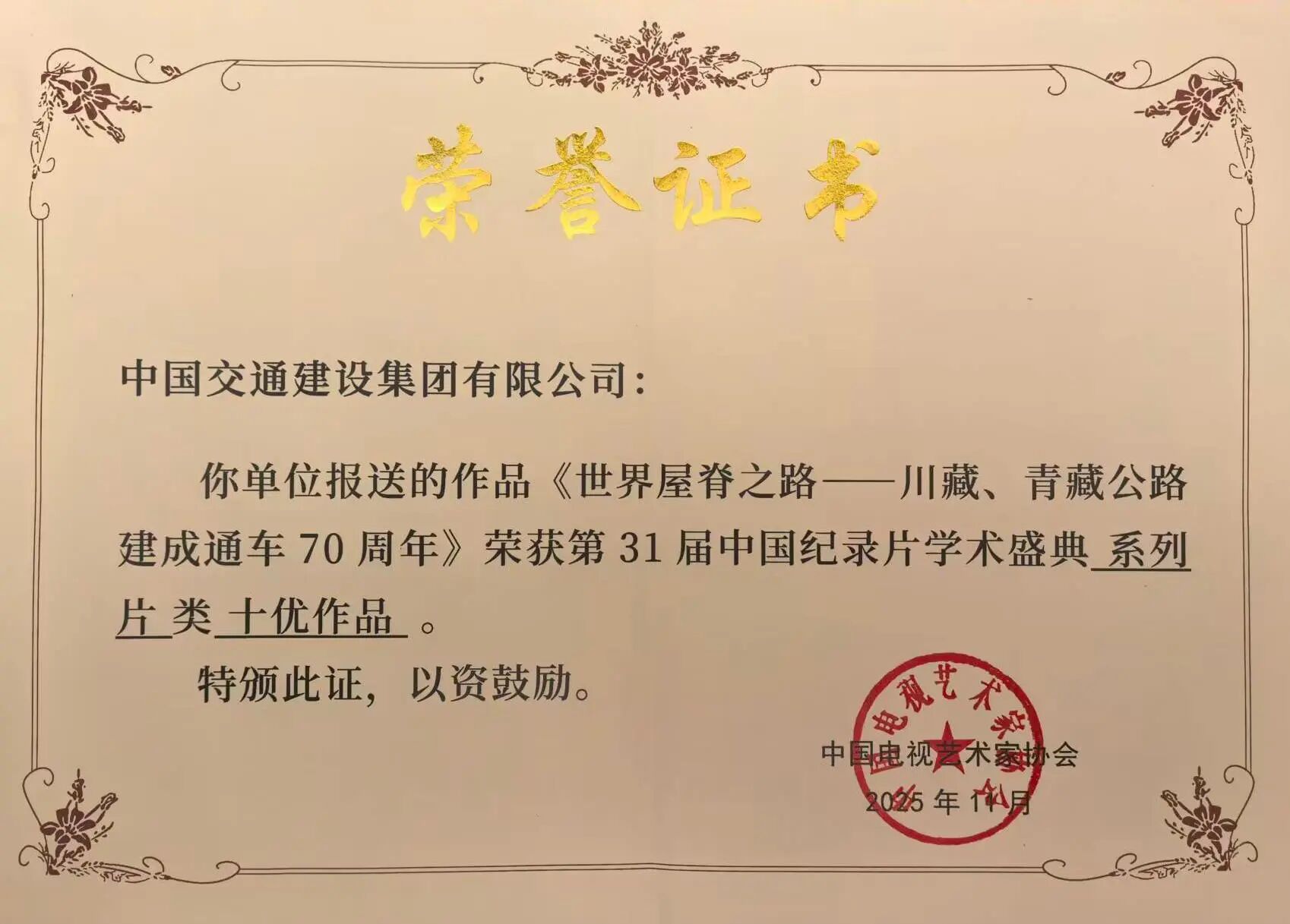 近日,第31屆中國紀錄片學術盛典在江蘇省無錫市舉行。由中央廣播電視總臺社教節目中心、中交集團、《中國公路》雜志社聯合制作的五集紀錄片《世界屋脊之路——川藏、青藏公路建成通車70周年》榮獲系列類“十優作品”。
