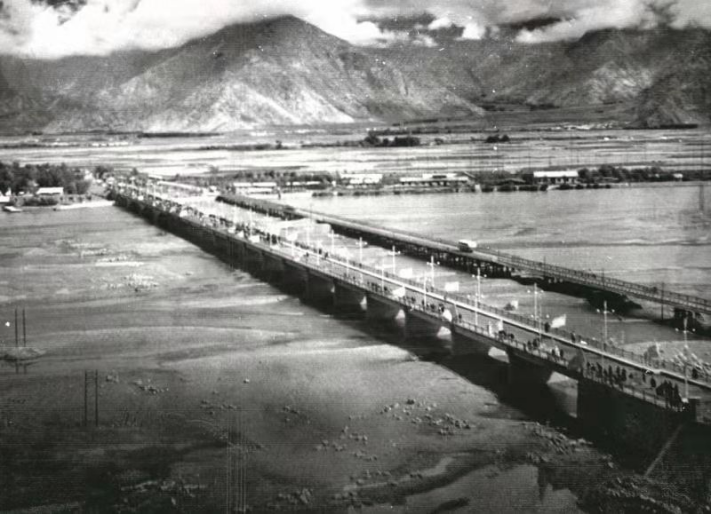 1965年8月,拉薩河上第一座鋼筋混凝土T型剛構(gòu)橋——拉薩大橋提前4個月通車。一張老照片留下了經(jīng)典的鏡頭:拉薩河上,兩橋并肩,10年前建成的鋼木結(jié)合橋梁“光榮退休”,鋼筋混凝土現(xiàn)代化橋梁“上崗”肩負新的使命。