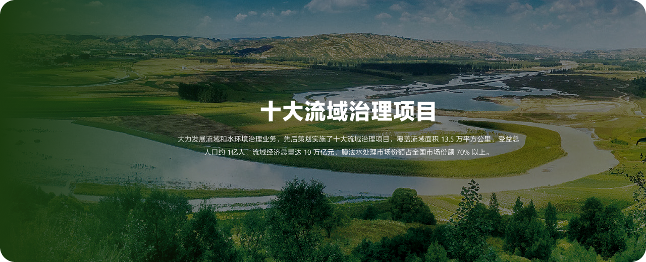 大力發(fā)展流域和水環(huán)境治理業(yè)務,先后策劃實施了十大流域治理項目,覆蓋流域面積 13.5 萬平方公里,受益總人口約 1億人,流域經(jīng)濟總量達 10 萬億元,膜法水處理市場份額占全國市場份額 70% 以上。