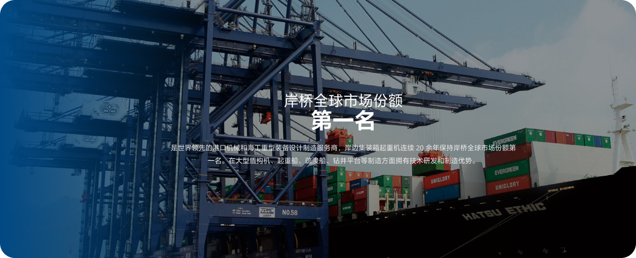 是世界領先的港口機械和海工重型裝備設計制造服務商,岸邊集裝箱起重機連續(xù) 20 余年保持岸橋全球市場份額第一名。在大型盾構機、起重船、疏浚船、鉆井平臺等制造方面擁有技術研發(fā)和制造優(yōu)勢。