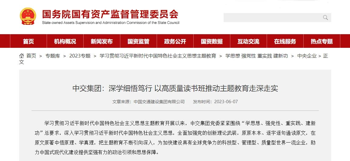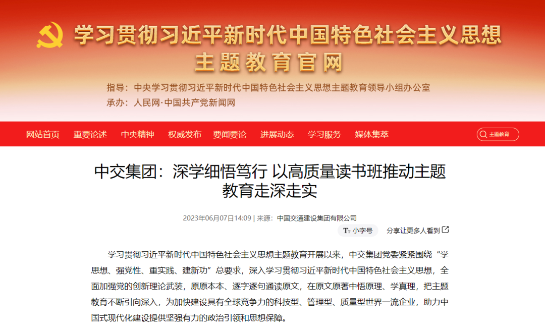 近日,學(xué)習(xí)貫徹習(xí)近平新時代中國特色社會主義思想主題教育官網(wǎng)和國務(wù)院國資委官網(wǎng),刊發(fā)了題為《中交集團:深學(xué)細悟篤行 以高質(zhì)量讀書班推動主題教育走深走實》的文章,報道中交集團深入開展學(xué)習(xí)貫徹習(xí)近平新時代中國特色社會主義思想主題教育情況。