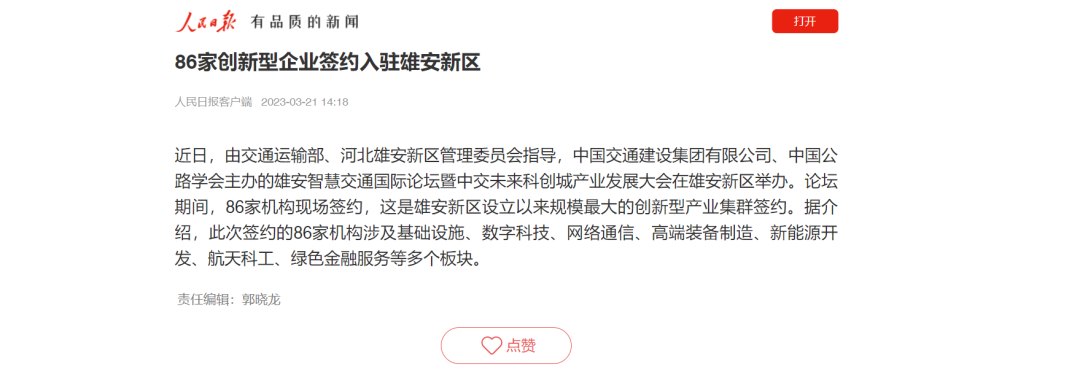 中國發(fā)展網(wǎng)刊發(fā)報道,論壇期間,雄安新區(qū)首批市場化項目中交未來科創(chuàng)城啟動全球招商,共有86家創(chuàng)新型企業(yè)現(xiàn)場簽約,包含了基礎(chǔ)設(shè)施、數(shù)字科技、網(wǎng)絡(luò)通信、高端裝備制造、新能源開發(fā)、航天科工、綠色金融服務(wù)等多個板塊,是雄安新區(qū)設(shè)立以來規(guī)模最大的創(chuàng)新型產(chǎn)業(yè)集群入駐。