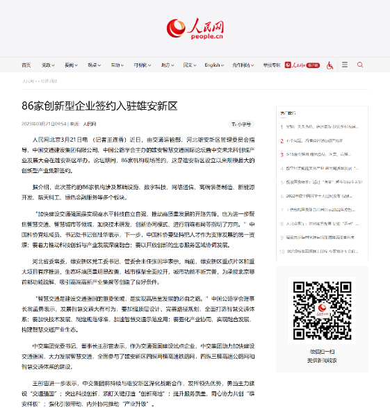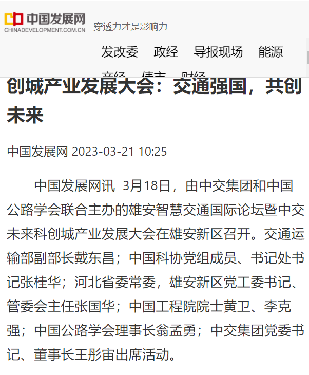 人民網(wǎng)刊發(fā)報道提及中交集團黨委書記、董事長王彤宙的致辭,中交集團將持續(xù)與雄安新區(qū)深化戰(zhàn)略合作,發(fā)揮領(lǐng)先優(yōu)勢,勇當(dāng)主力建設(shè)“交通強國”;突出科技創(chuàng)新,緊盯關(guān)鍵打造“創(chuàng)新高地”;提升服務(wù)質(zhì)量,同心協(xié)力共創(chuàng)“雄安樣板”;強化引領(lǐng)帶動,內(nèi)外協(xié)同推動“產(chǎn)業(yè)升級”。