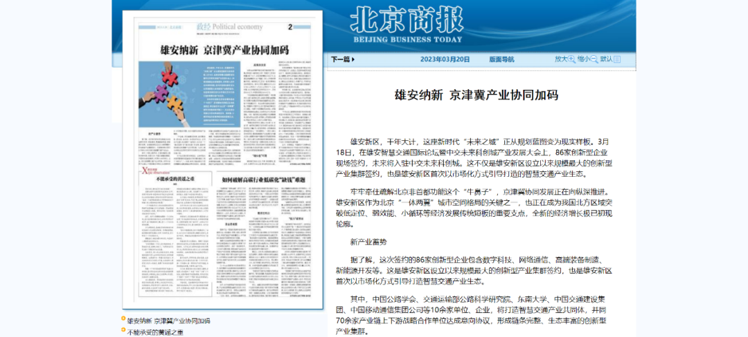 北京商報刊發(fā)報道,雄安新區(qū),千年大計,這座新時代“未來之城”正從規(guī)劃藍(lán)圖變?yōu)楝F(xiàn)實樣板。這不僅是雄安新區(qū)設(shè)立以來規(guī)模最大的創(chuàng)新型產(chǎn)業(yè)集群簽約,也是雄安新區(qū)首次以市場化方式引導(dǎo)打造的智慧交通產(chǎn)業(yè)生態(tài)。