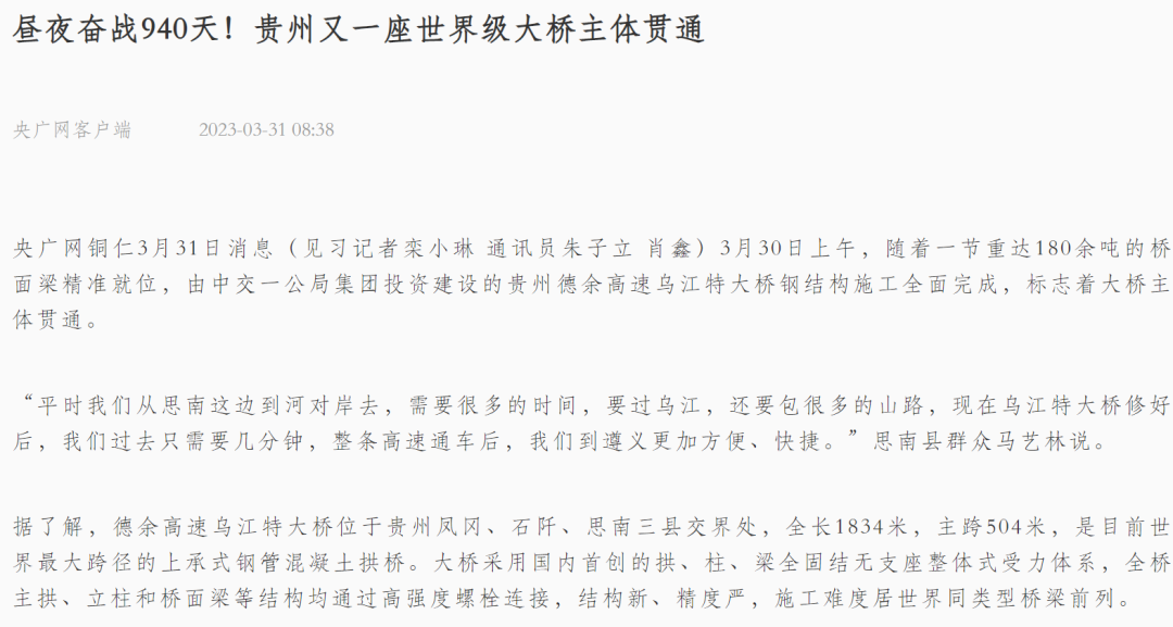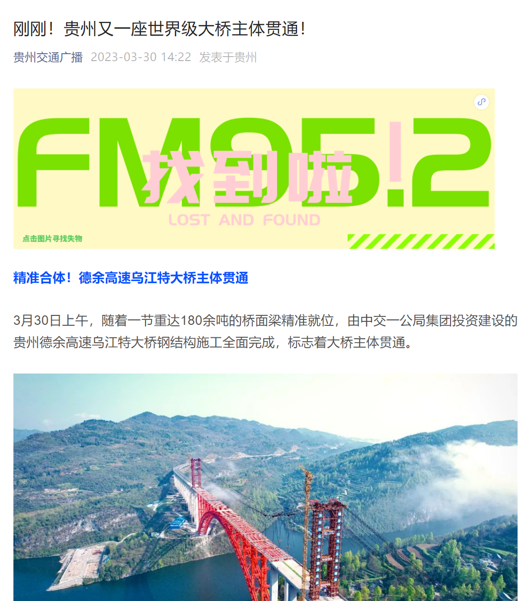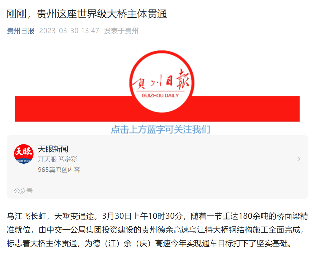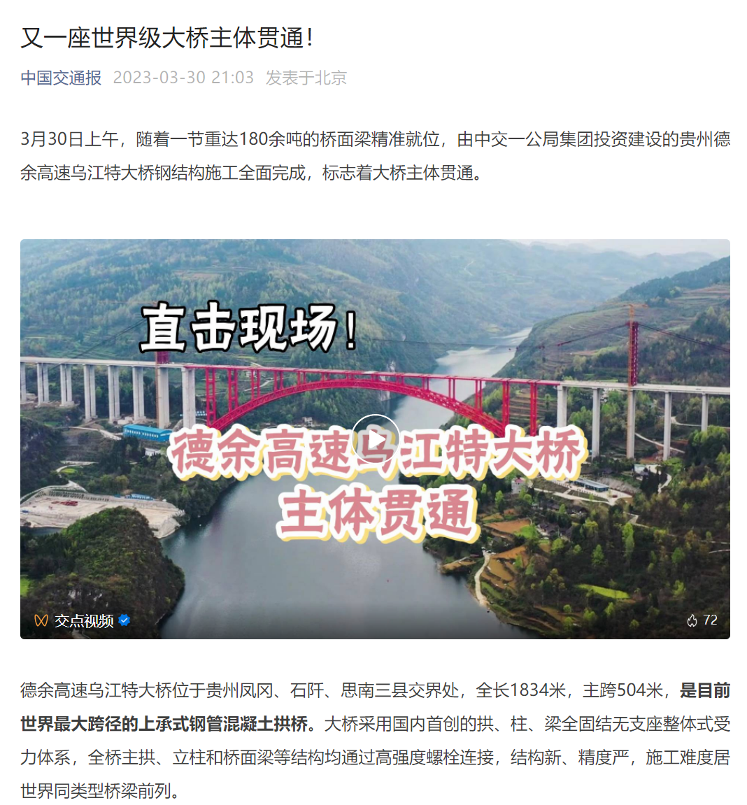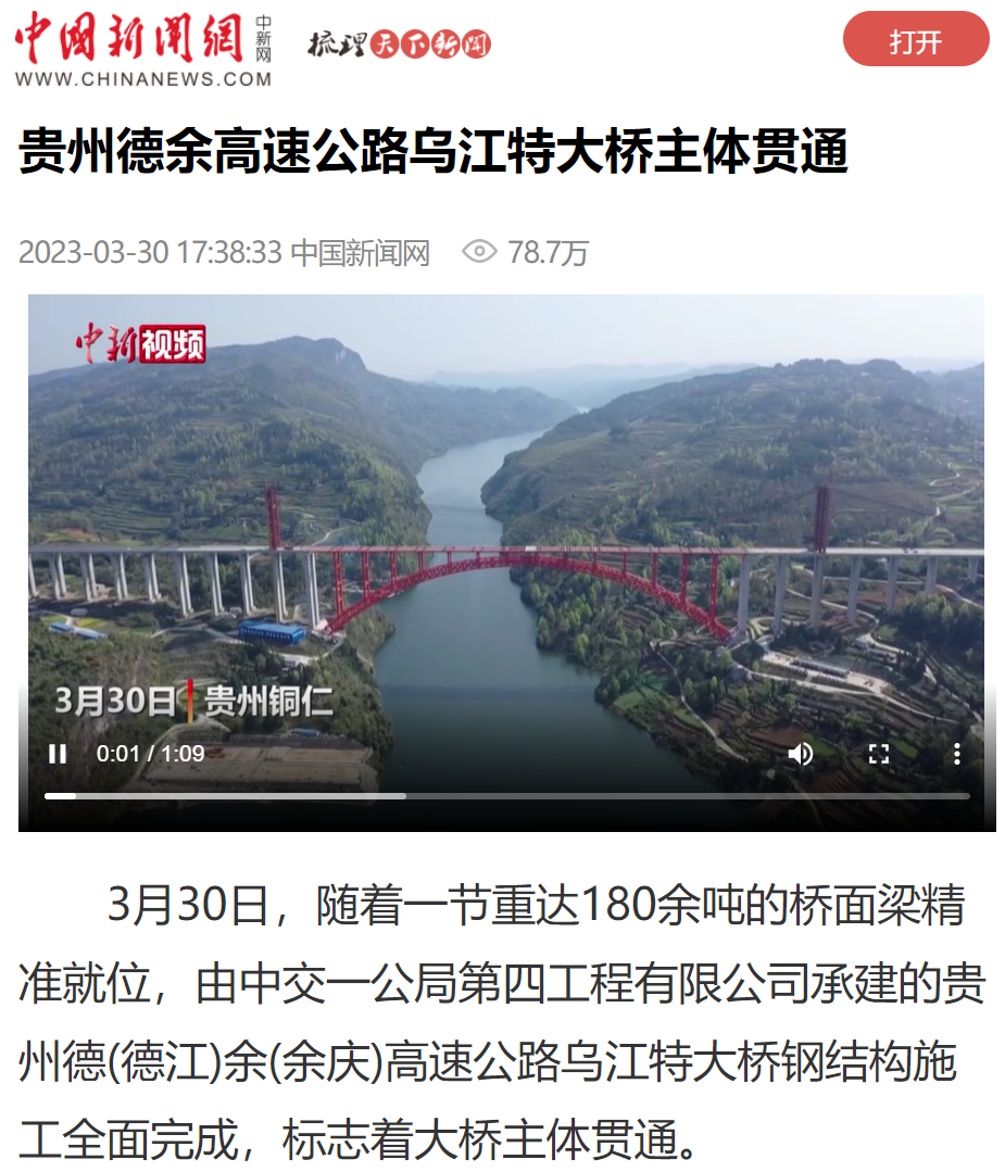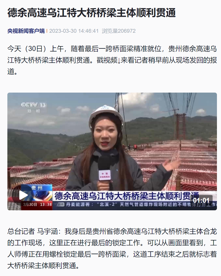 貫通直播共吸引200余萬網友圍觀互動,20余家主流媒體轉載烏江特大橋主體貫通消息,中交“出品”的超級工程再次刷屏全網。